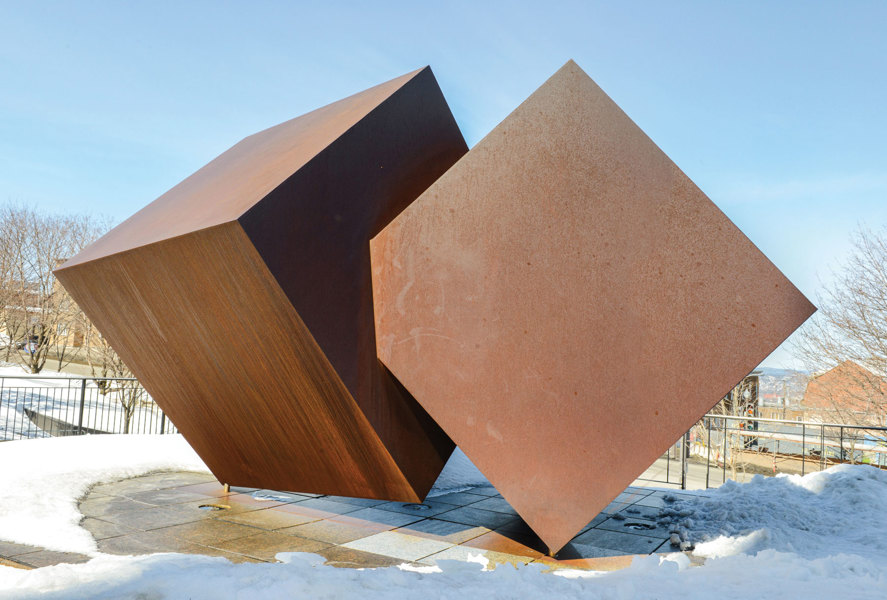 Composée de deux cubes d’acier imbriqués, cette sculpture forme en fait une seule entité : un couple reposant sur une base en granit. Selon l’angle de vue, elle présente une variété de plans et d’angles où joue la lumière.