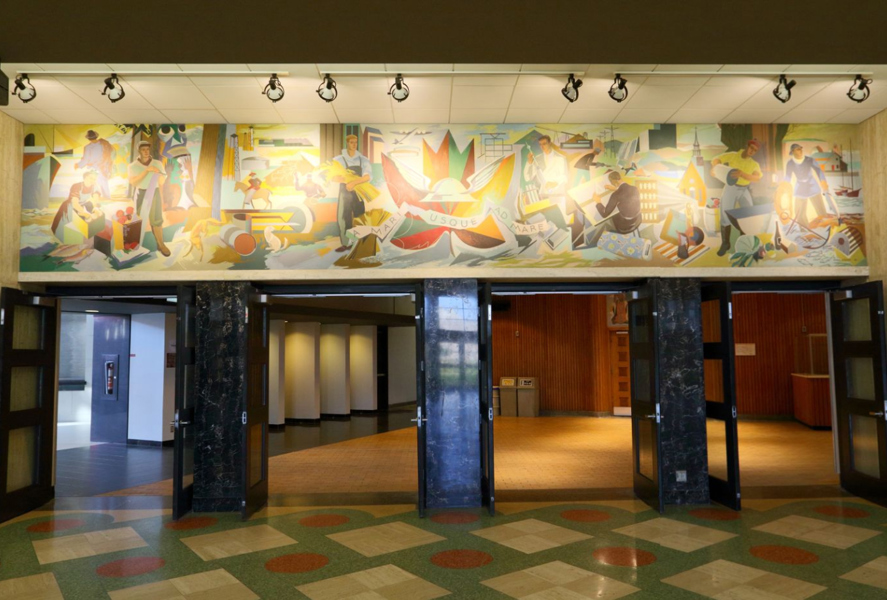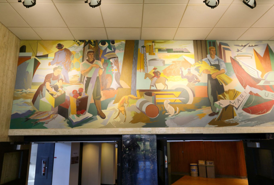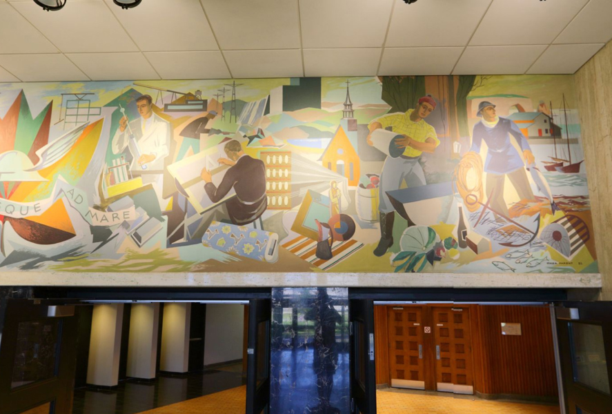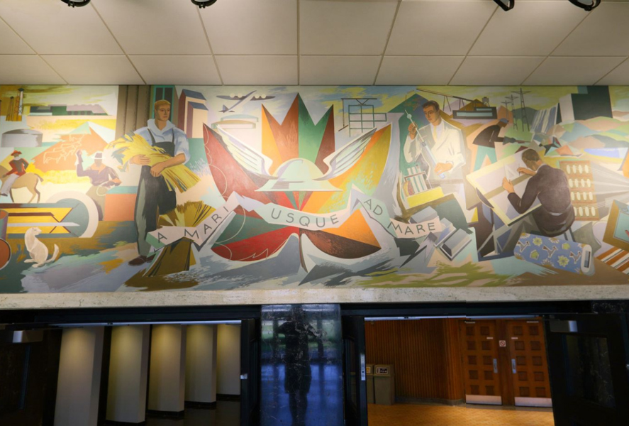 La peinture représente différentes activités commerciales pratiquées au Canada d'un océan à l'autre: les pêcheries de l'océan Pacifique, les cultures fruitières, l'industrie forestière, l'art autochtone, la chasse et la traite des fourrures, les puisements pétroliers, l'élevage, l'agriculture, l'aéronautique, la chimie, l'extraction minière, la production hydroélectrique, l'ingénierie et l'architecture, le textile et l'artisanat, l'acériculture, les cultures maraîchères, puis les pêcheries de l'océan Atlantique. Au centre, on retrouve une feuille d'érable, un des emblèmes du Canada. Elle est superposée d'un listel où est inscrite la devise du Canada, et du casque ailé d'Hermès, dieu grec du commerce, symbole de l'invisibilité, de l'invulnérabilité et de la puissance.
