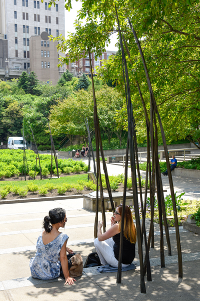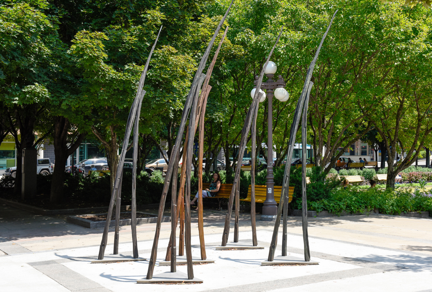 Les Attracteurs forment un ensemble de 36 sculptures, étranges créatures à la silhouette gracile, toutes uniques. Regroupées par trois ou par cinq, près de la moitié sont interactives. En les approchant, on pourra les voir « s’allumer » et murmurer des sons insolites, comme venus du sol même.