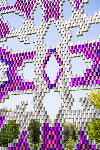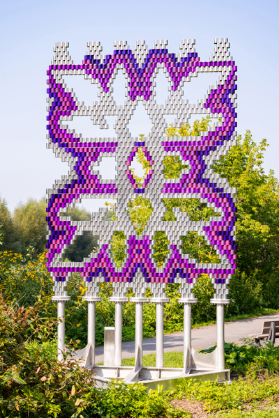 Quel délicat motif semble ici brodé dans le rideau de verdure ? Cette sculpture se compose de perles métalliques peintes en nuances de rose ou polies comme des miroirs. Sa silhouette géométrique figure une plante médicinale. Une dentelle qui encadre et reflète le paysage. De fait, cette œuvre contemporaine réinvente l’art autochtone du tissage de perles colorées. En agençant les pièces, elle symbolise les liens qui nous unissent aux objets et aux lieux. Elle métisse ainsi les époques et les cultures tout en célébrant la magie de la nature. Son titre signifie d’ailleurs « faire une offrande et rendre grâce » en langue anichinabée.