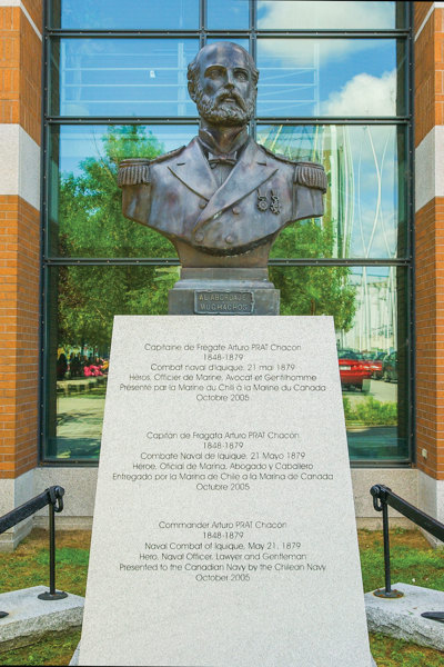 Le capitaine de frégate Arturo Prat Chacón (1848-1879), officier de la marine chilienne, meurt en héros dans un affrontement naval au début de la guerre du Pacifique, qui oppose le Chili et le Pérou de 1879 à 1884. Le monument lui rend hommage tout en rappelant la collaboration des marines canadienne et chilienne dans plusieurs opérations navales.