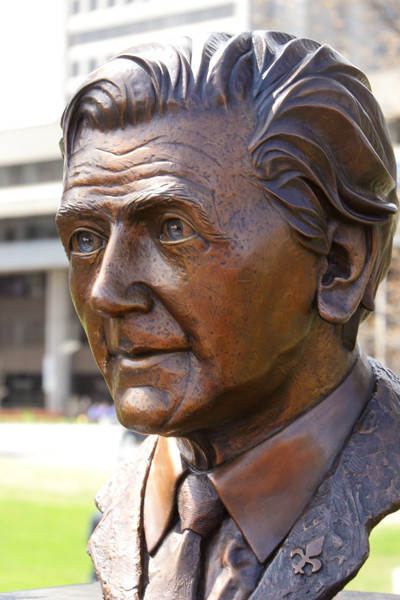 Ministre dans le gouvernement de René Lévesque de 1977 à 1984, Camille Laurin fait adopter la Charte de la langue française, ou loi 101, par laquelle le français devient la langue officielle du Québec. Le buste est une réplique de celui qui a été installé près de l’édifice Camille-Laurin à Montréal. Le socle est gravé d’une citation de l’homme politique, pour qui « la langue est le fondement même d’un peuple ».