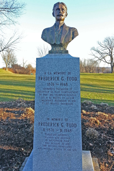Frederick Gage Todd est considéré comme le premier architecte paysagiste au Canada. Il conçoit en 1909 le plan d’aménagement des plaines d’Abraham, futur parc des Champs-de-Bataille, dont les travaux vont s’échelonner sur 50 ans.