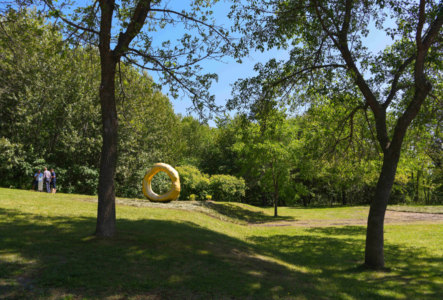 Posé à l'entrée du parc, un grand anneau rutilant marque une transition entre l'espace habité et l'espace naturel. Sa couleur dorée est inspirée des arts décoratifs, comme la joaillerie et le mobilier, mais aussi de certains monuments publics ou religieux. L'intime y côtoie le grandiose.