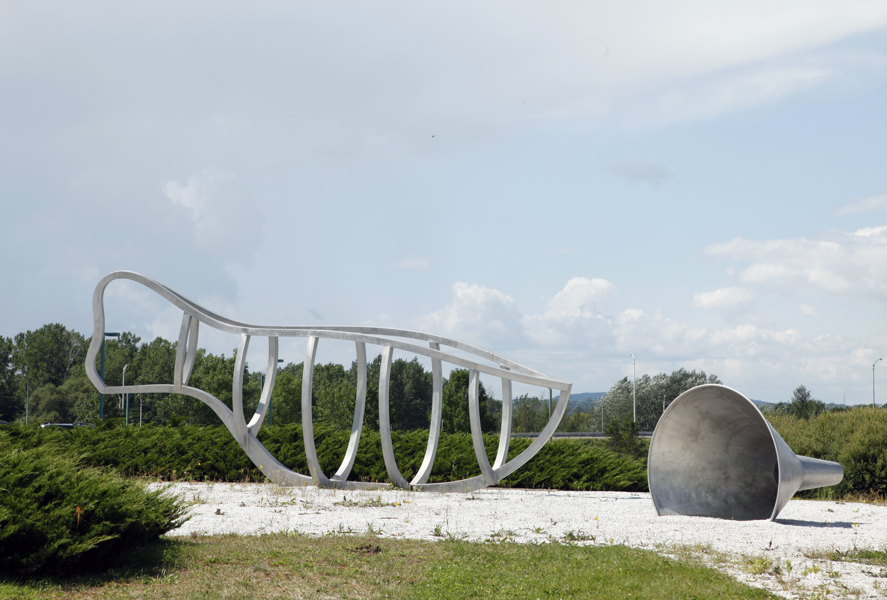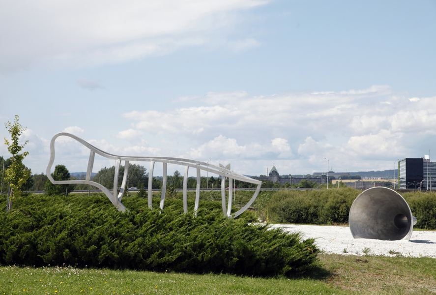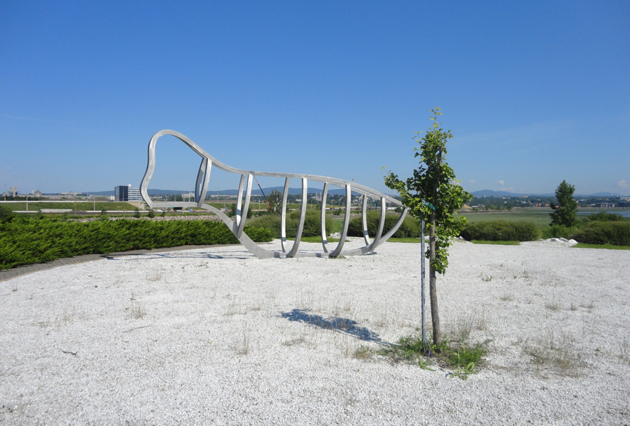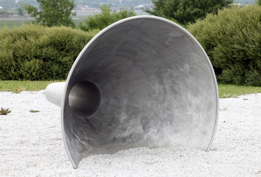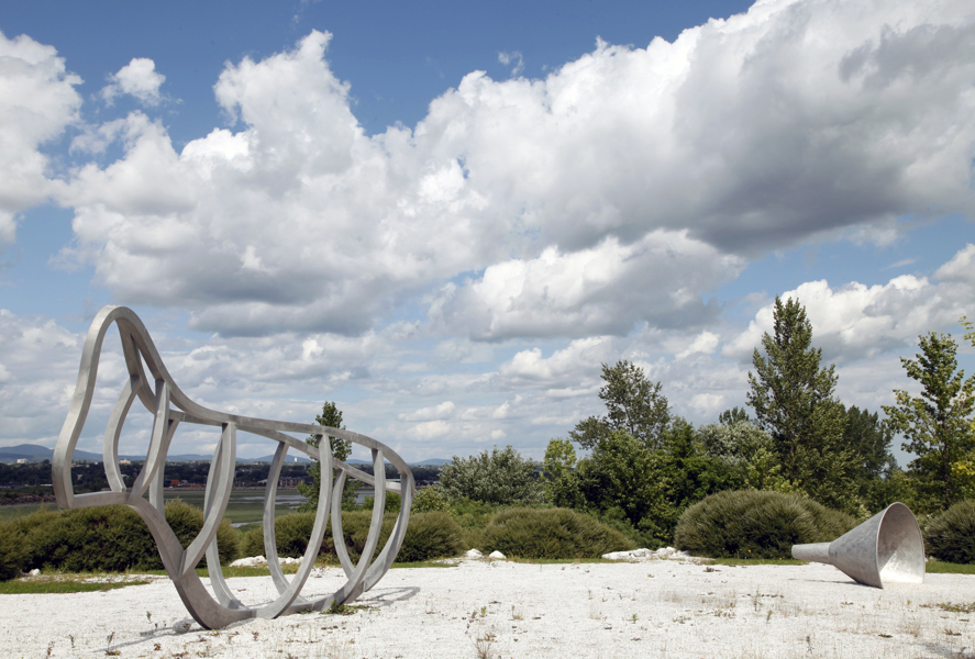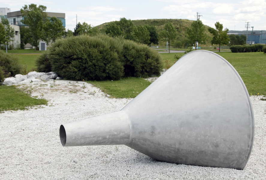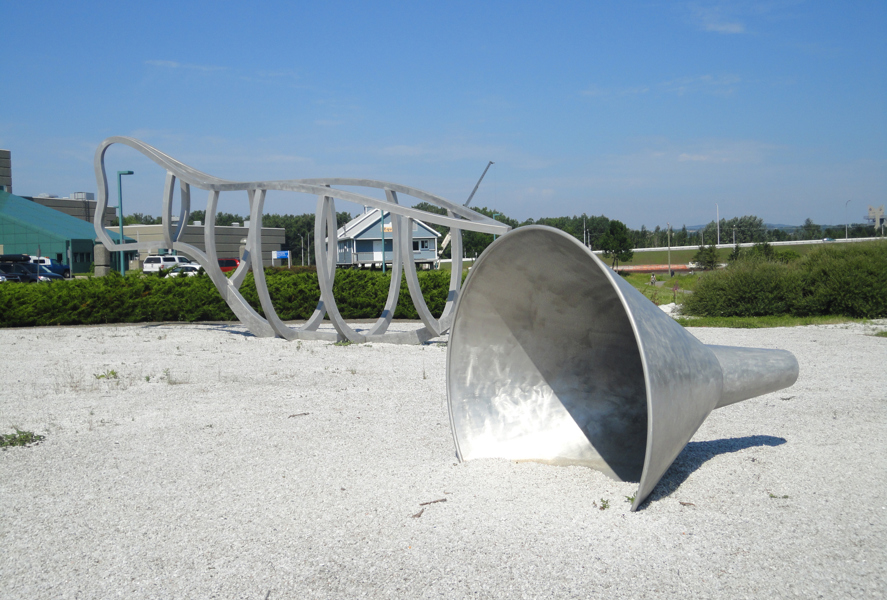 Ce poisson-bateau en aluminium vogue sur une plage près de la baie de Beauport, en face de l’usine d’épuration de la Ville. Son squelette rappelle la disparition de plusieurs espèces du fleuve Saint-Laurent, dont le bar rayé (réintroduit depuis). L’installation est complétée par un entonnoir géant qui évoque à la fois les porte-voix des capitaines d’antan et les filtres employés pour traiter les eaux usées.