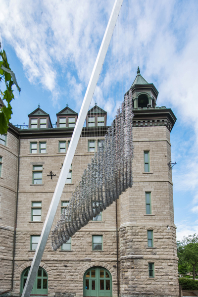 Codex Populi est la plus haute œuvre d’art public de Québec. Elle est constituée d’un mat incliné de 23 mètres – l’équivalent d’un bâtiment de 7 étages! L’œuvre rend hommage à la Conférence de Québec de 1864, où ont été élaborées plusieurs règles de fonctionnement du Canada. Les 9 520 crochets suspendus symbolisent les signatures des personnes ayant participé aux décisions politiques.