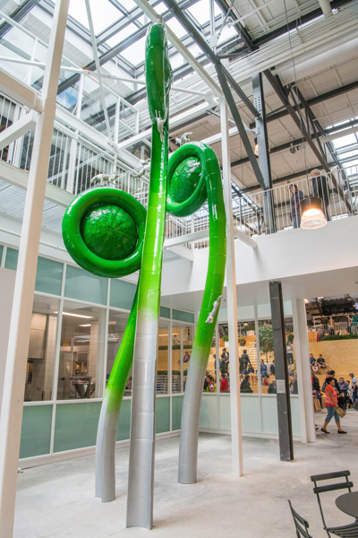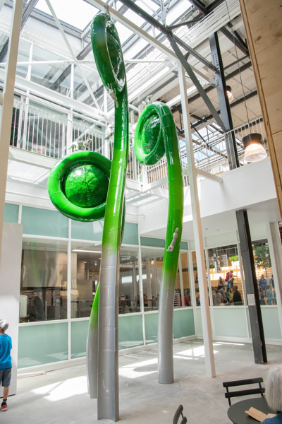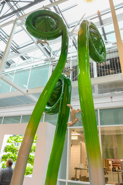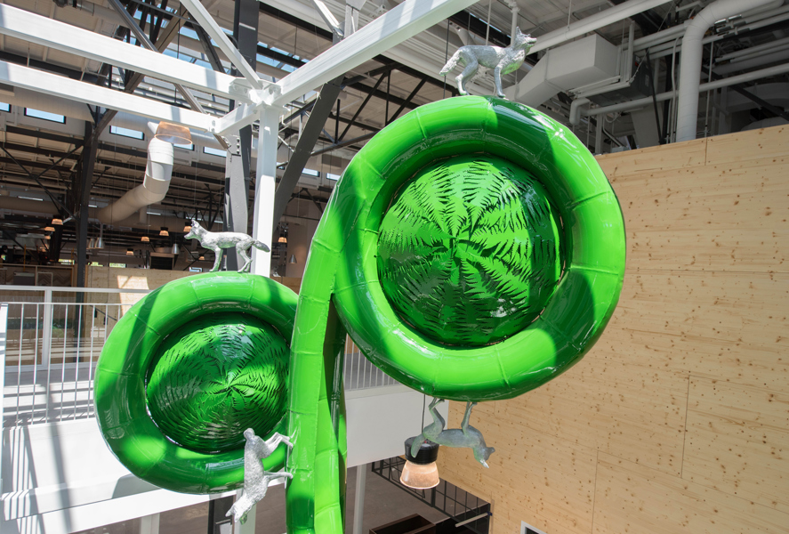 Les artistes ont magnifié ces trésors de la nature en leur donnant une stature géante et en leur associant de discrets renards roux, représentés en miniature le long des tiges. Ces deux symboles de la flore et la faune laurentiennes cohabitent dans une clairière de légende, un lieu où les plus grands protègent les petits, où chacun participe à l’équilibre naturel et à la richesse du terroir.