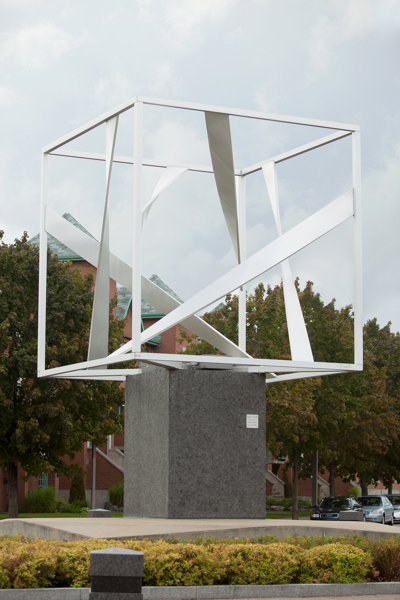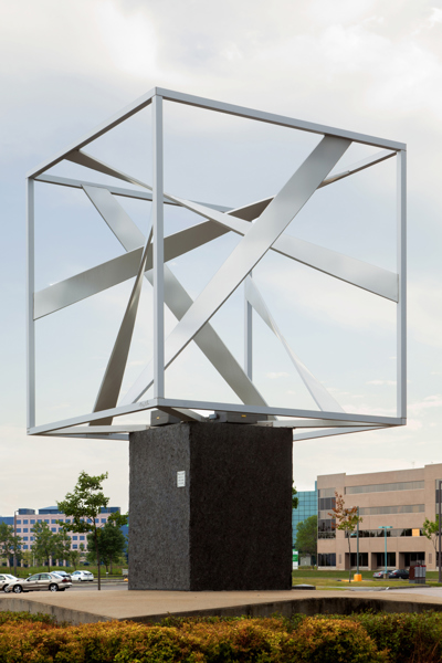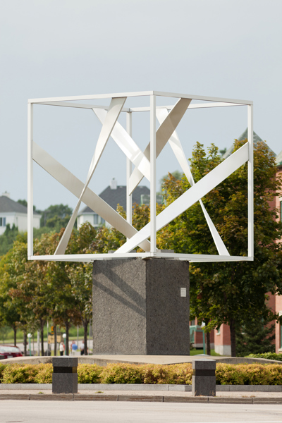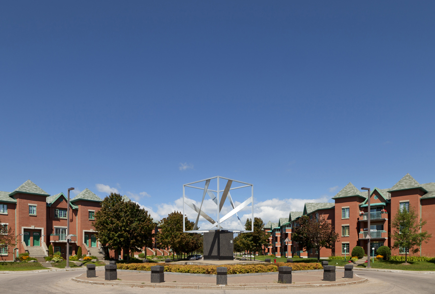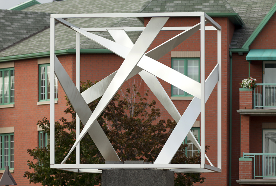 Cette sculpture en aluminium occupe le rond-point où se rencontrent les rues Le Mesnil et du Massif. La structure extérieure du cube, aux lignes nettes et rigides, représente le corps humain, alors que les lamelles de forme indéfinie qui s’entrecroisent à l’intérieur sont une métaphore de l’âme qui l’habite.