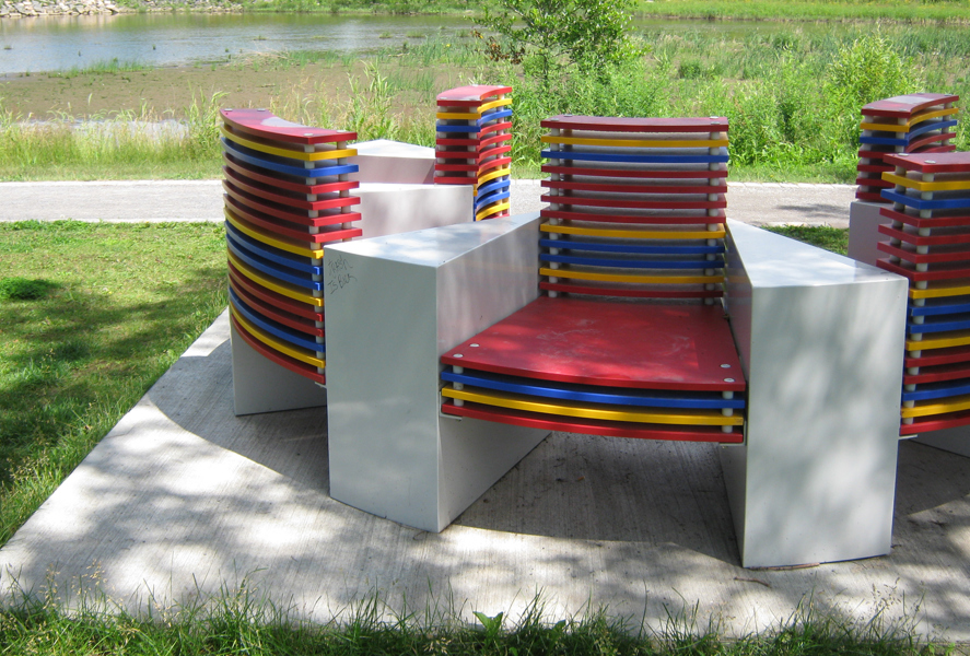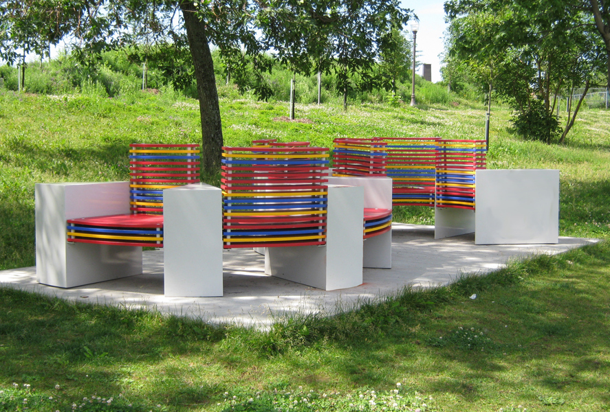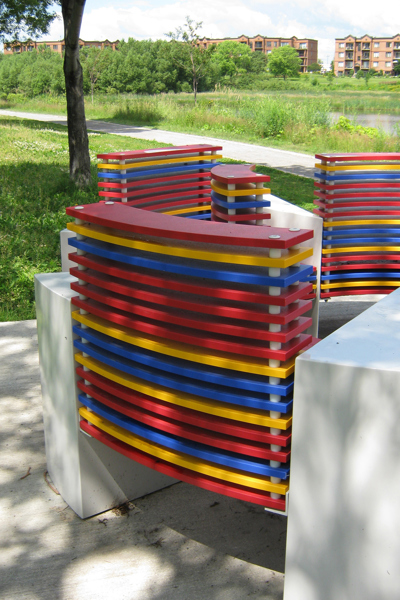 Colorée et ludique, la sculpture-banc réinterprète le confident, ce fauteuil ancien en forme de S où deux personnes peuvent s'asseoir en vis-à-vis. Les formes courbes ont été inspirées par les méandres de la rivière.