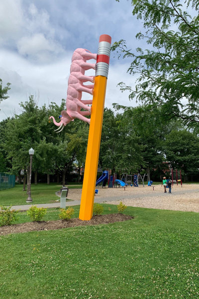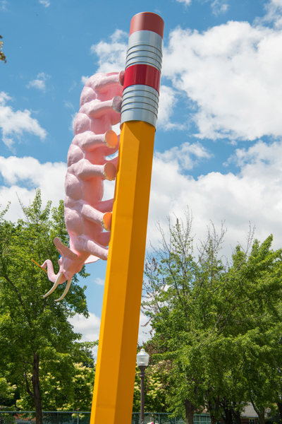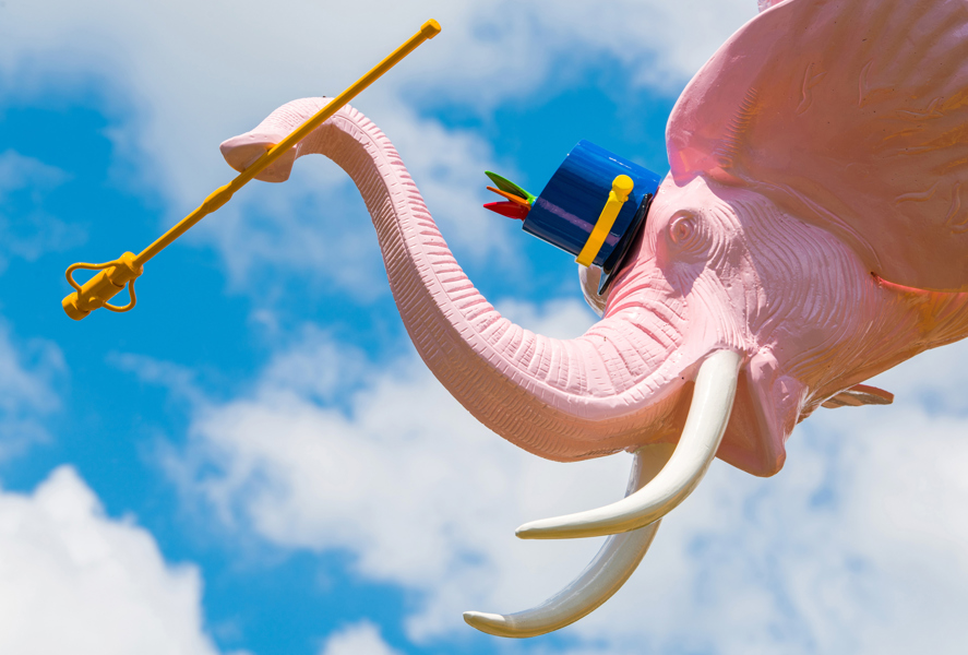 « Dessine-moi un mouton », implorait le Petit Prince. Cette chenille-éléphant l’aurait sûrement charmé! Coiffée d’une casquette de chef de fanfare, la créature rose trottine sur un crayon géant. L’outil symbolise l’éducation; l’éléphant, la sagesse; la chenille, la métamorphose. Leur rencontre improbable évoque le bonheur d’apprendre.