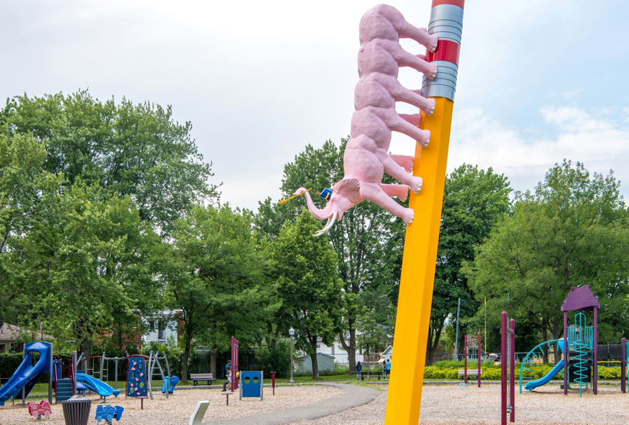 Hommage à l’imagination enfantine, cette sculpture en aluminium peint est née d’une démarche de cocréation engageant des élèves de l’école primaire des Jeunes-du-Monde. Le duo Cooke-Sasseville en a tiré une oeuvre empreinte de fantaisie et d’humour. Son art est hardi, coloré et souvent peuplé d’animaux. De quoi éveiller le petit philosophe qui sommeille en chaque humain.