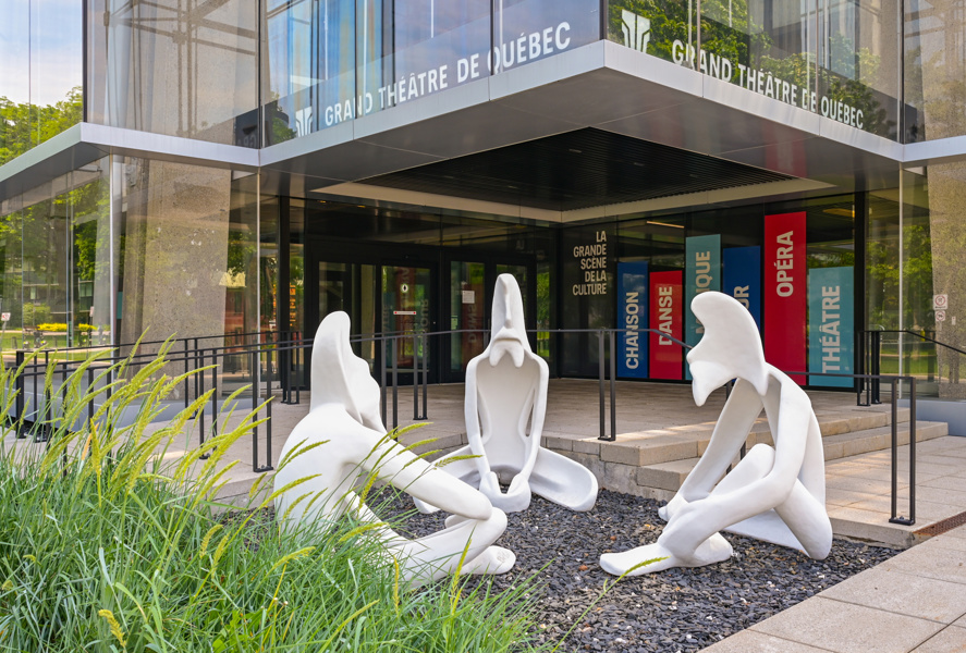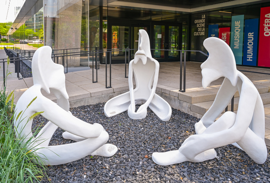 Sur le terrain du Grand Théâtre de Québec, trois sages assis en cercle semblent en pleine discussion. Mais l’atmosphère est au calme et à la réflexion plus qu’à la dispute. Fidèle à sa manière minimaliste, Lewis Pagé a exprimé en quelques traits bien accusés la profondeur de l’esprit humain.