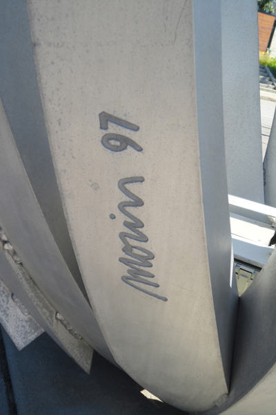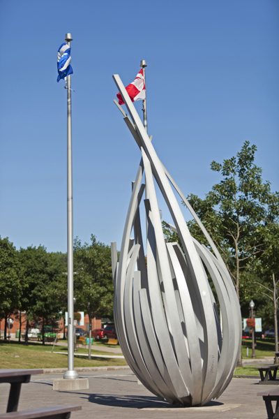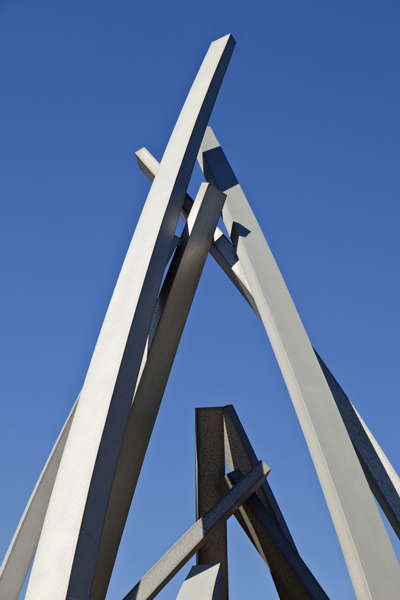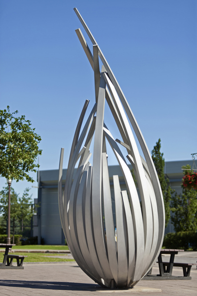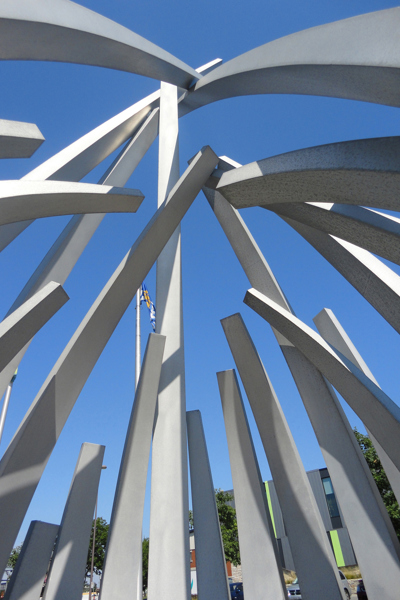 De loin, les grandes tiges de métal ressemblent à des bras jetés en l’air, prêts à célébrer à l’unisson un concert ou un événement sportif. Il faut s’approcher de la structure en aluminium pour prendre conscience d’une autre dimension de l’œuvre. On peut alors y distinguer un nid ou une corolle protectrice, abritant un être en devenir.