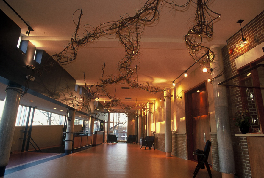 Chacun de ces éléments porte une lecture plurielle, celle de faire référence au chêne et au corps humain, car il n'y a pas de théâtre sans représentation du corps. La feuille rongée par le temps qui apparaît en filigrane sur la fenêtre est la main tendue, offerte : l’invitation. Les textures du chapeau du gland gravées dans le verre font penser aux plis et aux cicatrices de la peau : la temporalité. L'enchevêtrement au plafond renvoie aux systèmes nerveux, sanguin ou pulmonaire : l'énergie.