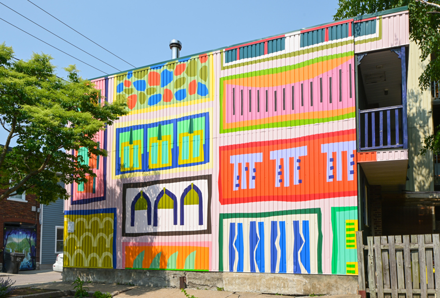 Réalisée dans un contexte de médiation culturelle, cette œuvre a permis à près de 50 élèves des écoles Saint-Malo et Marguerite-Bourgeoys d’être initiés à l’art mural et au processus de création artistique. L’artiste Ilana Pichon, dont la pratique est ancrée dans l’in situ, a sensibilisé les enfants à leur environnement et aux caractéristiques architecturales de leur quartier en déambulant dans les rues de Saint-Sauveur. En récoltant des informations picturales et en participant à plusieurs ateliers en classe, les élèves ont conçu ensemble deux œuvres murales ensuite peintes par l’artiste. Celle-ci est située au 375, Kirouac, l’autre au 125, Oscar-Drouin.