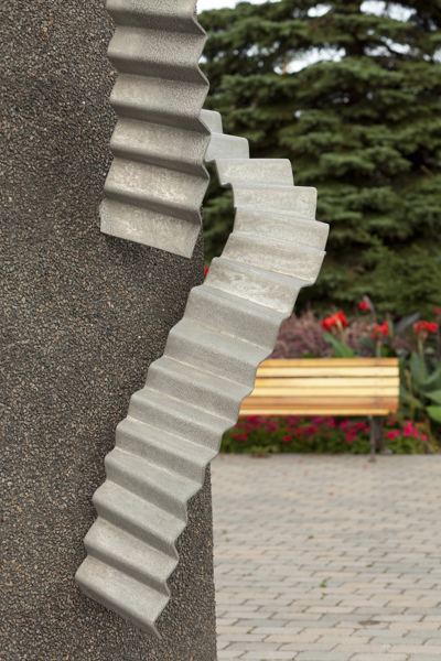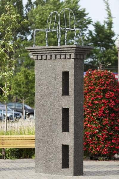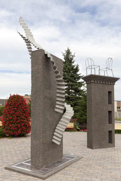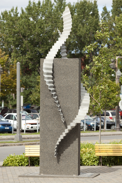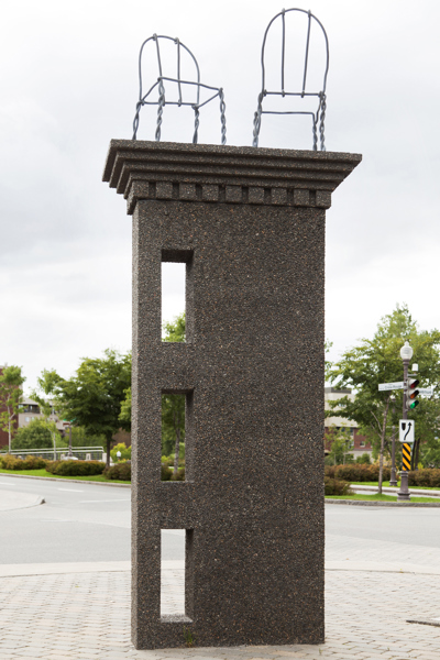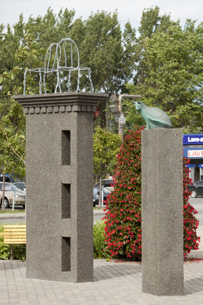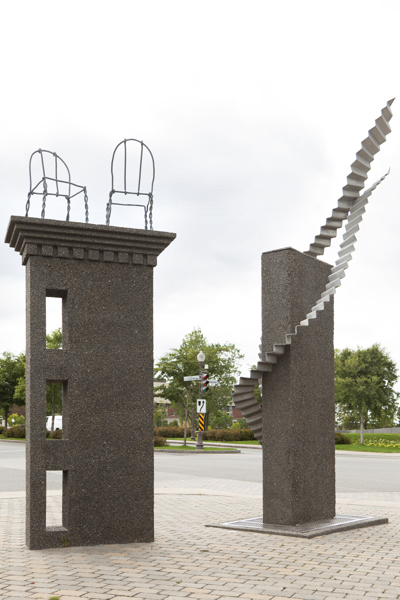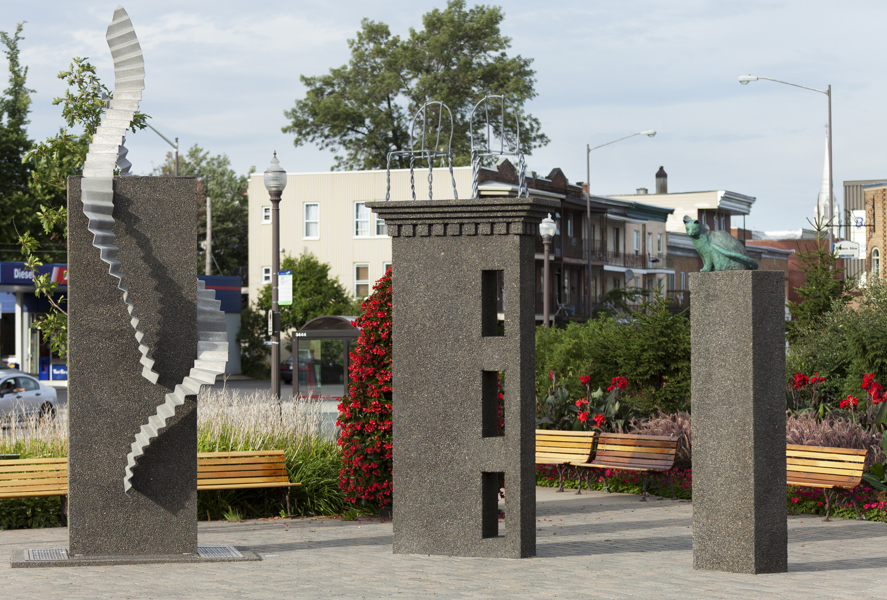 Des chats, des chaises, des escaliers métalliques qui grimpent vers le ciel… Ce trio de sculptures juchées sur des piédestaux dévoile une partie de l’âme du quartier Limoilou. L’installation-signature résume l’art de vivre dans ce vieux quartier ouvrier aux ruelles animées.