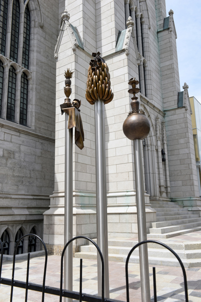 Trois mâts soutiennent un assemblage hétéroclite d’objets réalistes coulés en bronze. Un crâne humain, un régime de bananes, une boule disco… belle énigme à décoder! En fait, cette nature morte contemporaine rappelle que la vie est éphémère et que la vanité humaine doit être endiguée. Elle nous invite à revenir à l’essentiel, peut-être en fréquentant la bibliothèque voisine, lieu de pensée et de culture.