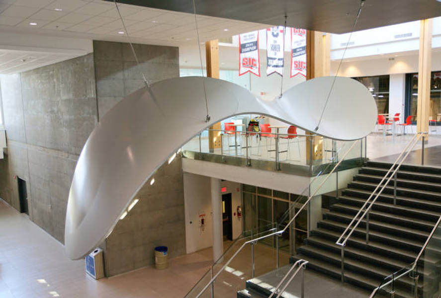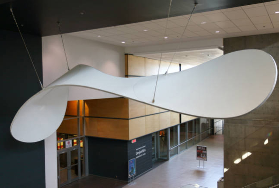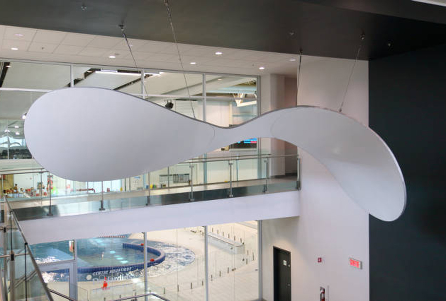 Forme de mouvement et de stabilité, Équilibre accompagne le geste architectural qui marque les lieux de passage du nouveau bâtiment du PEPS et se pose comme le centre d’une composition visuelle renouvelée. Ses courbes et contre-courbes tracent les dessins d’un mouvement fluide dont l’orientation latérale entraîne le regard dans un va-et-vient perpétuel. La longue forme blanche marque, par les contrastes de ses galbes et de sa couleur, cette aire de transition. Ainsi, elle devient le cœur d’un nouvel ensemble coloré, modulé par le rouge vibrant, le gris silex et les blancs mat et lustré de ses surfaces. La sculpture prend place horizontalement au centre de l’espace de passage. Vue de loin, on perçoit la totalité de son dessin. Ses formes à la fois pures et stylisées, se transforment au fur et à mesure de nos déplacements. Tel un dôme lumineux, elle surplombe la montée ou la descente de nos allées et venues. (…) Dans un rapport d’équilibre, entre la connaissance et l’entraînement physique, la sculpture s’anime de l’esprit d’excellence et du bien-être de la pratique sportive. À la fois monumentale et légère, la sculpture flotte librement et sans restriction en transportant les formes du libre esprit qui permet à chaque individu d’avoir un regard dégagé sur le monde.