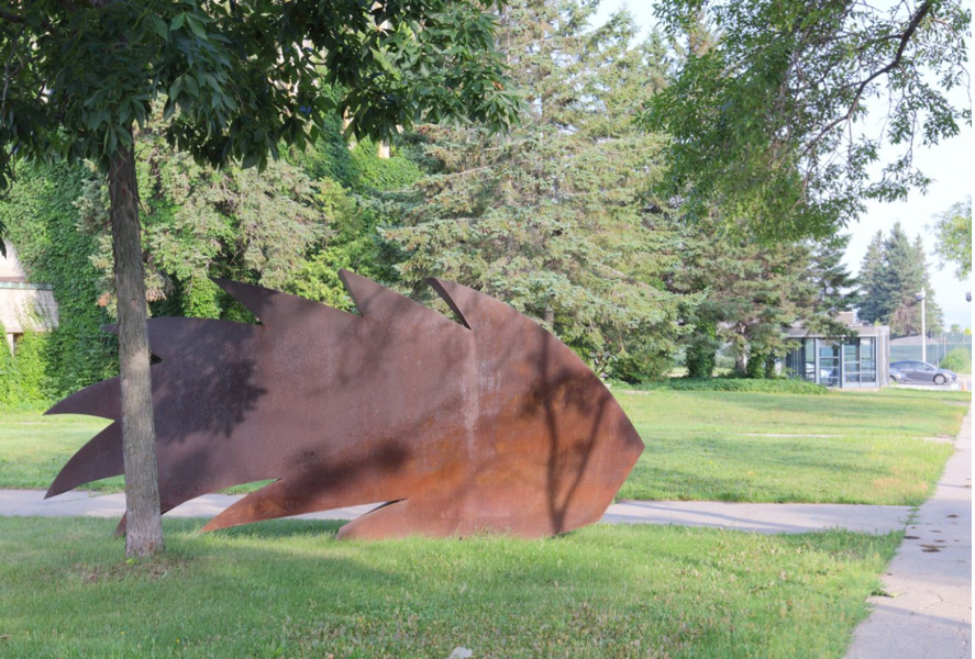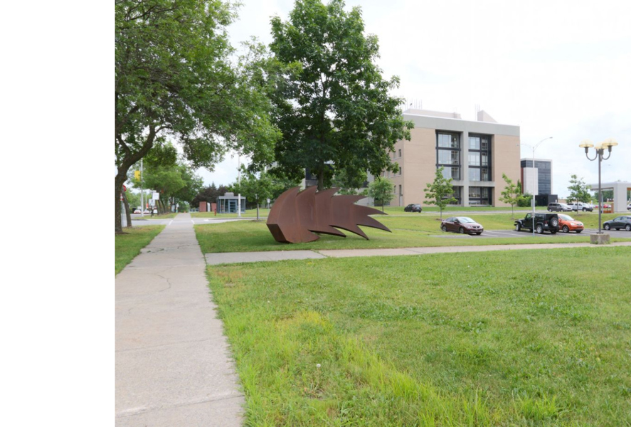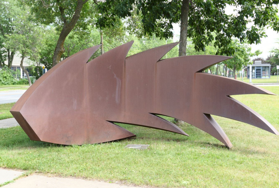 La sculpture évoque la forme d'une feuille-flamme, thème de prédilection de l'artiste qui l'a façonnée selon les règles d'une imagerie schématisée. L'œuvre réfère directement à notre univers visant la confrontation de l'être avec les forces de la nature.