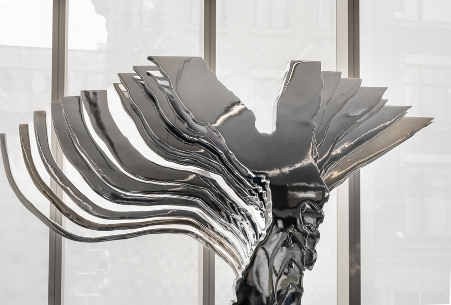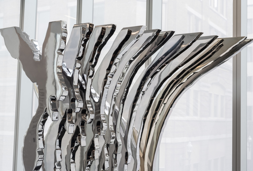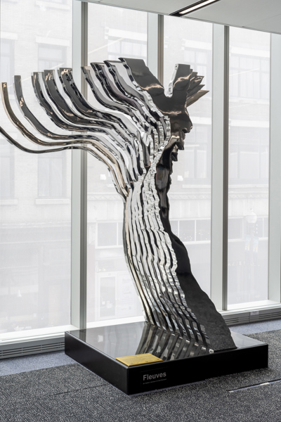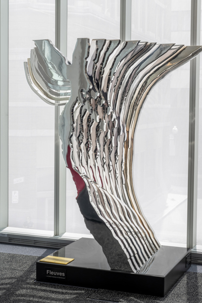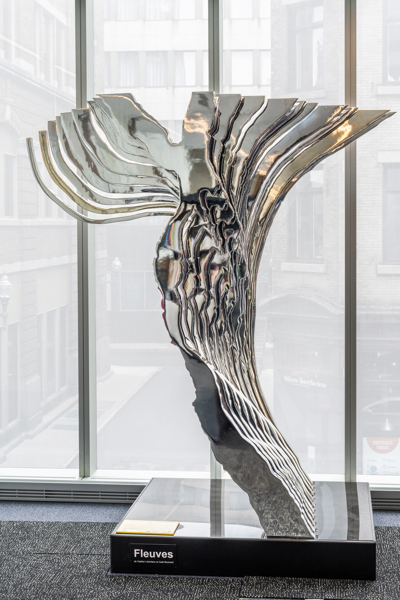 Cette sculpture présente la rencontre du fleuve Saint-Laurent (Québec) et de la Meuse (Namur). Façonnée de manière à former un « Y » aux allures majestueuses, l’œuvre présente, à l’avant et à l’arrière, les tracés originaux des cours d’eau liés par des strates intermédiaires.