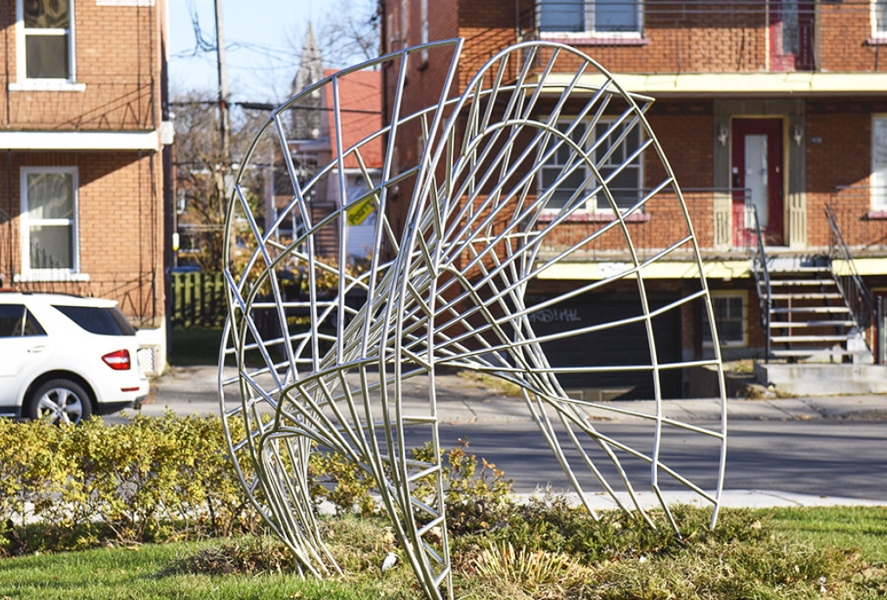 Cette structure faite de 150 tiges métalliques dessine une silhouette aérienne. Elle décompose le mouvement d’une gymnaste exécutant un saut arrière. Le métal est le matériau de prédilection de ce créateur très engagé dans le milieu des arts à Québec, aujourd’hui réputé pour ses œuvres figuratives.