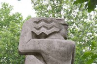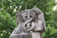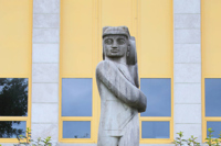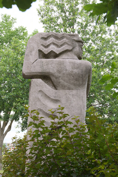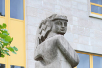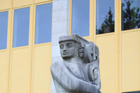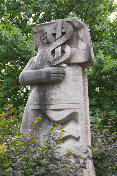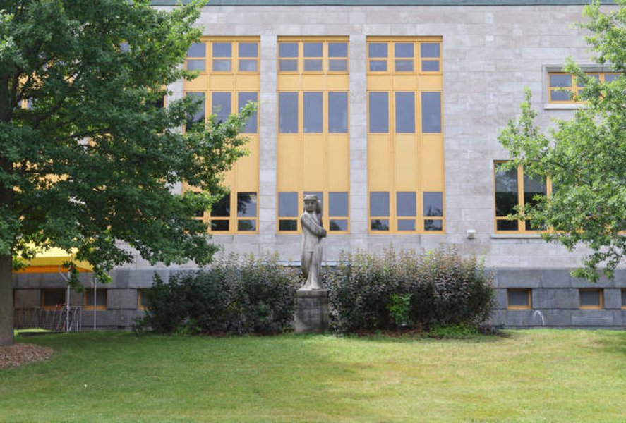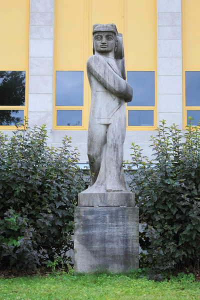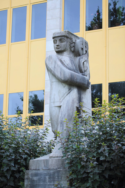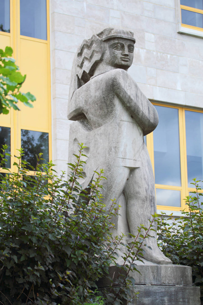 La sculpture représente Hermès, le dieu grec du commerce. Il est représenté comme un jeune homme debout, la tête de face, le corps de profil, les jambes de face et le pied gauche en avant. Il est accompagné de trois de ses attributs: il porte un casque et des sandales ailés et tient dans ses mains le caducée, c'est-à-dire un bâton ailé entouré de deux serpents, symbole du commerce.
