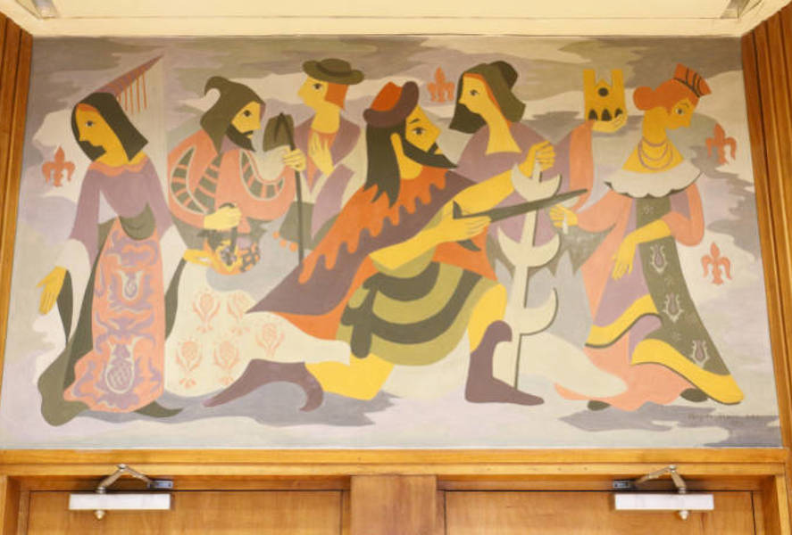 La peinture représente une première partie de la légende d'Hermès, le dieu grec du commerce et des voyageurs, au moment où il fabrique le caducée, un de ses attributs et symbole du commerce, à partir d'une branche d'olivier. La scène semble se dérouler en France comme le laissent croire les personnages accompagnés d'iris (fleurs de lys), symbole de la royauté française, et d'une représentation miniature de la cathédrale Notre-Dame-de-Paris.