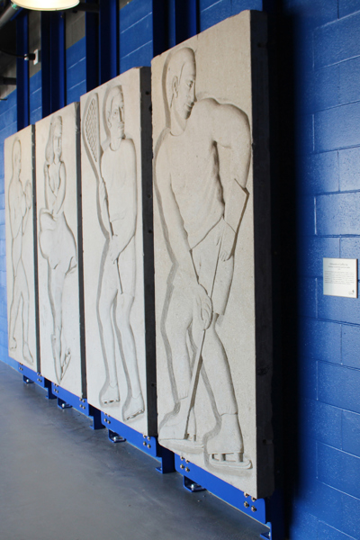 Ces bas-reliefs illustrent quatre activités populaires à Québec : la boxe, le patinage artistique, la crosse et le hockey. Ils ont été réalisés en 1950 pour orner le Colisée de Québec, construit l’année précédente. Intégrés à la façade du bâtiment, les bas-reliefs ont été déplacés dans le hall en 1981 lors de l’agrandissement du Colisée, puis réinstallés au pavillon de la Jeunesse en 2020. Les œuvres, en calcaire de la région du Niagara, sont attribuées à Raymond Delwaide, sculpteur sur pierre de l’entreprise de Québec Delwaide et Goffin Inc.