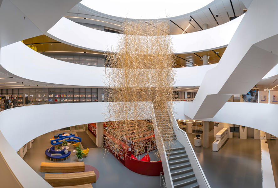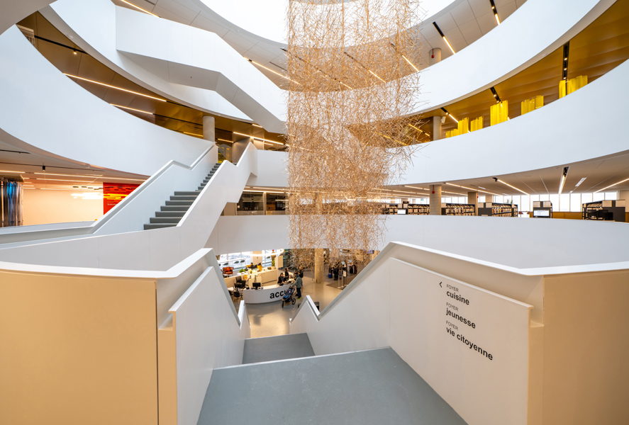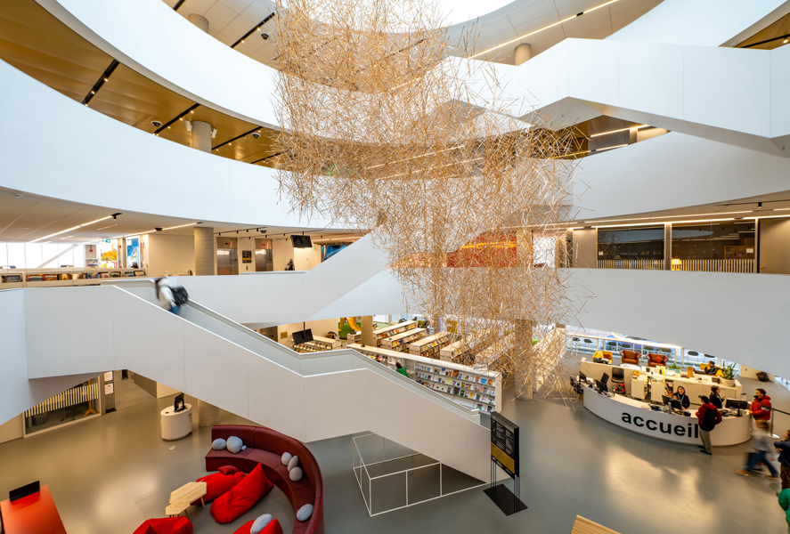 Cette délicate bruine d’or scintille en silence, comme les multiples gouttes d’une pluie au mouvement suspendu. La dizaine de milliers de languettes d'aluminium au fini doré qui la composent réfléchissent la lumière ou s’en détournent. Elles font ainsi apparaitre et disparaitre les fines tiges dans une valse qui projette des éclats brillants vers les étages de la bibliothèque.
