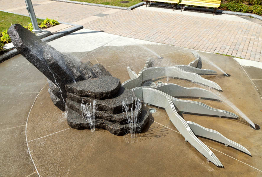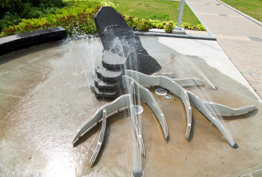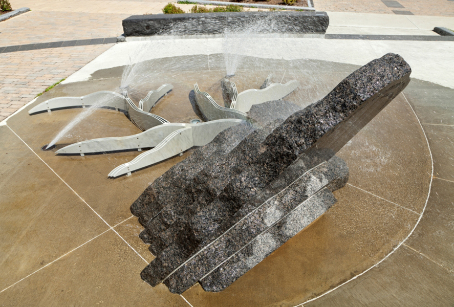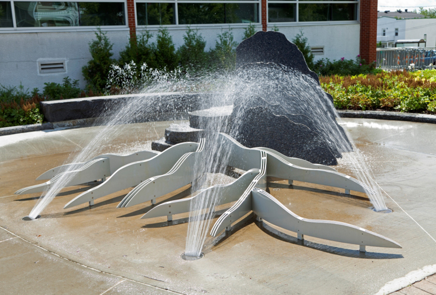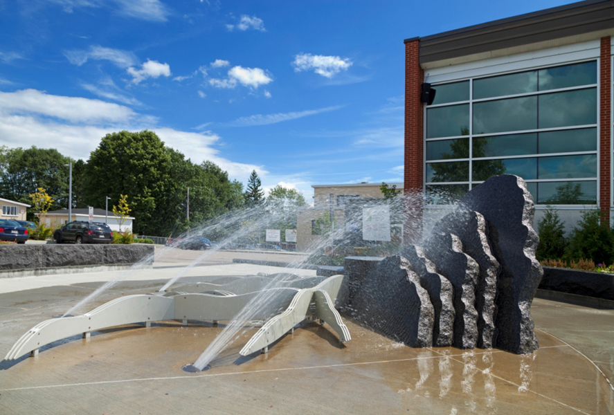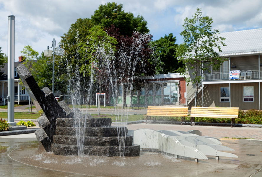 Je vous entends rêver, douce comme rivière. Extraite de la chanson Les gens de mon pays, de Gilles Vigneault, cette phrase a inspiré le titre de la sculpture-fontaine. L’œuvre est composée de deux masses de granite sombre aux formes irrégulières simulant le mouvement de la croûte terrestre qui a donné naissance au paysage environnant. À leur base émergent des lames d’aluminium brillant qui ondulent en tous sens, telles les rivières qui parcourent le territoire.