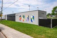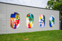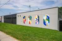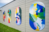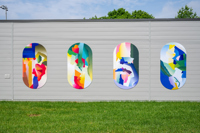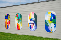 Cette oeuvre prend la forme de quatre hublots de grand format qui s’ouvrent sur une exploration du territoire. Les aplats graphiques aux couleurs et dégradés variés rappellent les différentes tonalités des saisons. Les multiples parcelles juxtaposées qui les constituent correspondent d’ailleurs à une cinquantaine de codes postaux des environs, observés à vol d’oiseau sur une carte. De ces compositions visuelles se dégage cette même sérénité qui est palpable dans les rues à proximité. Elles évoquent une série de paysages imbriqués où se côtoient lacs, vues du ciel, fleurs, patinoires et espaces verts. L’ensemble invite à une évasion par l’art, ou encore par les loisirs et les sports.