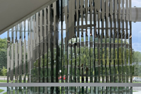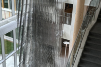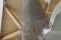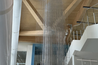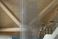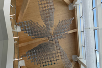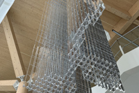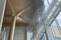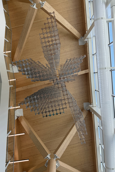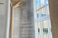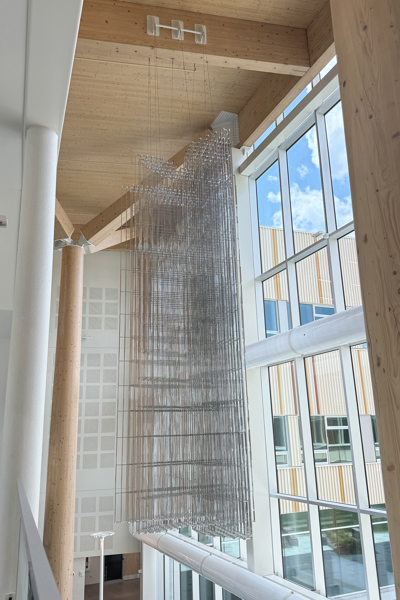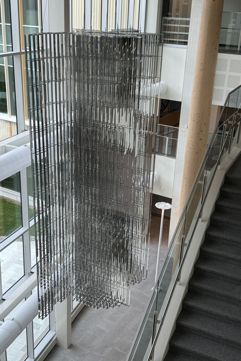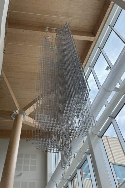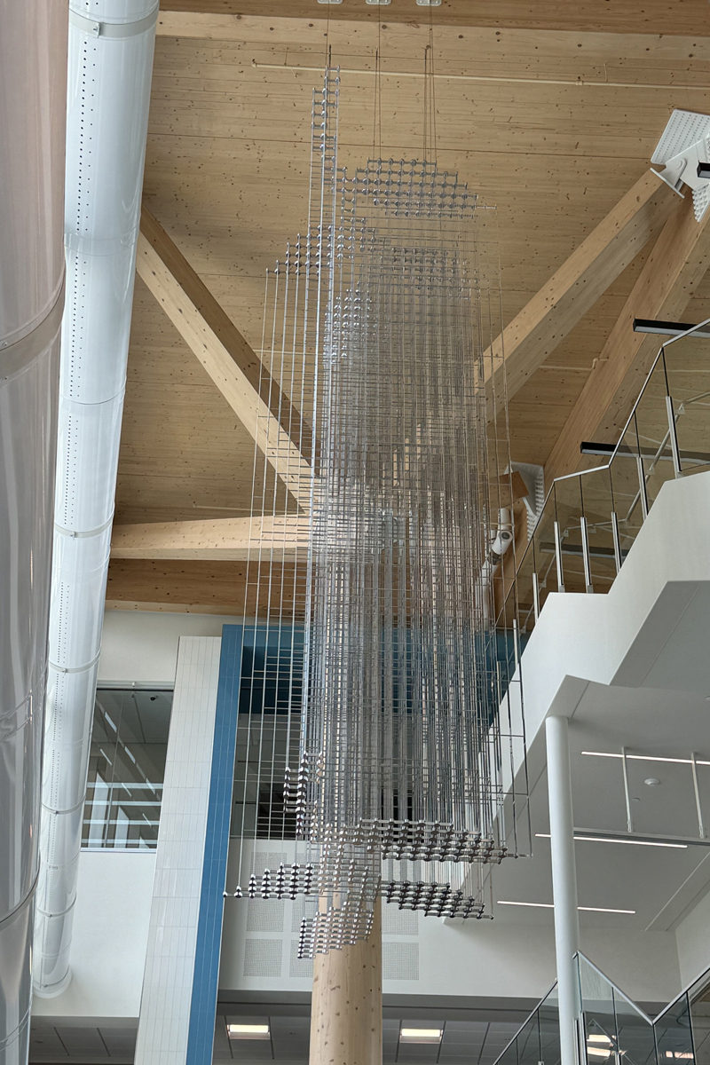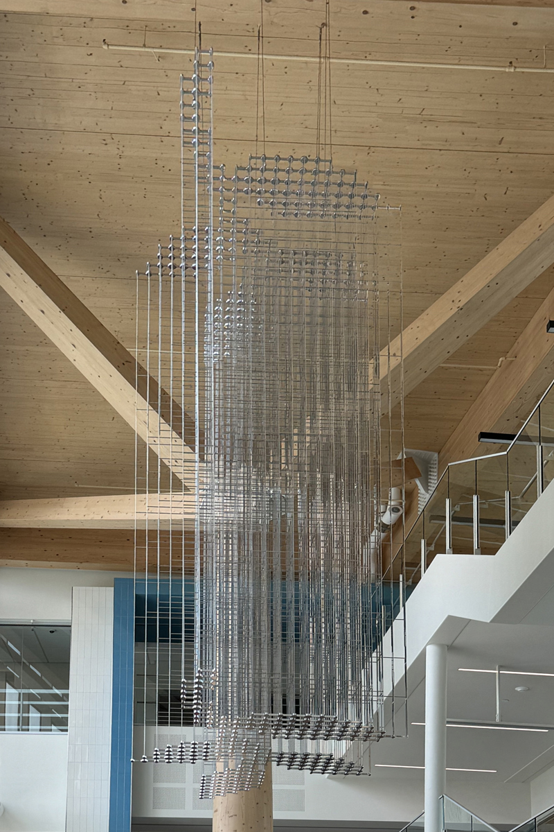 Dans son ruissellement argenté, cette œuvre cache des illusions de nature. Pouvez-vous les repérer ? Vue de côté, elle fait apparaître un arbre majestueux ; vue du dessous, un rameau de feuilles. Ses tiges d’aluminium poussent aussi dru que de jeunes bouleaux. Le message : en forêt comme en classe, les êtres vivants ont besoin de leur communauté pour s’épanouir.