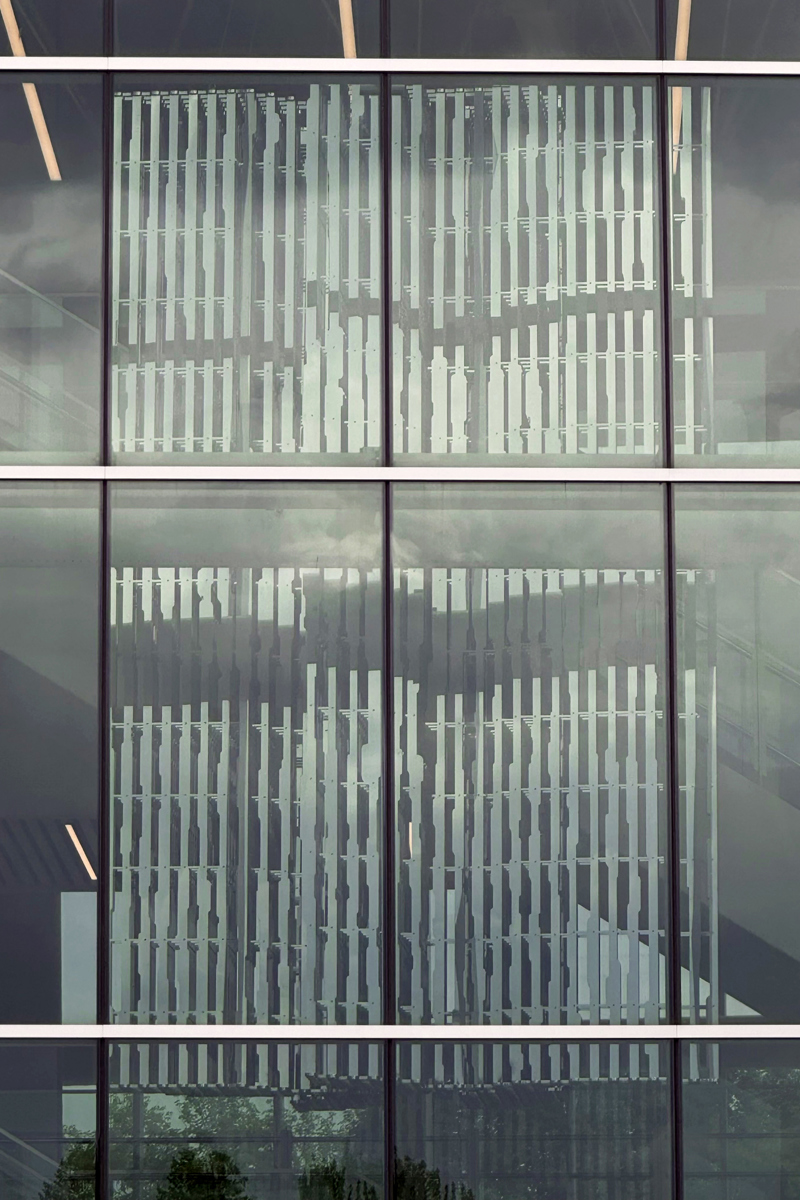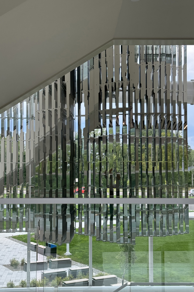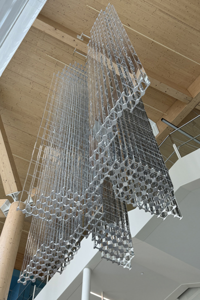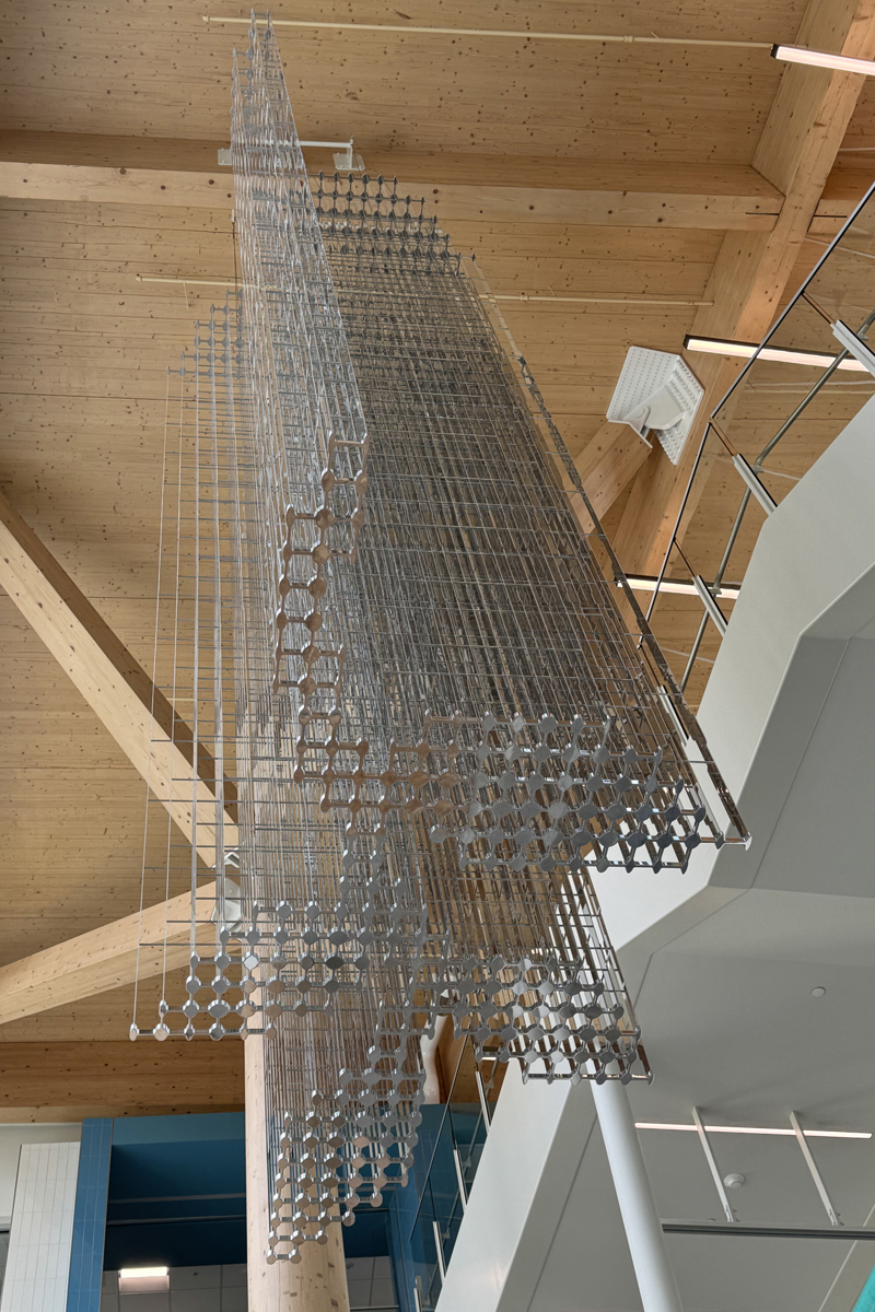 Malgré sa hauteur de 6 m, l’installation s’insère avec légèreté dans le hall vitré. Ses trouées créent un jeu de transparence ; sa surface polie reflète les mouvements. Un repère marquant pour les élèves qui apprennent ici à devenir les citoyens et citoyennes de demain.