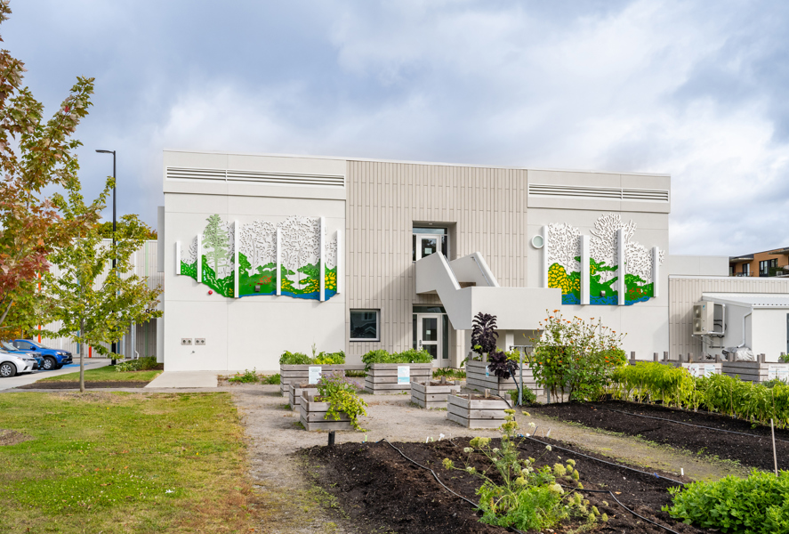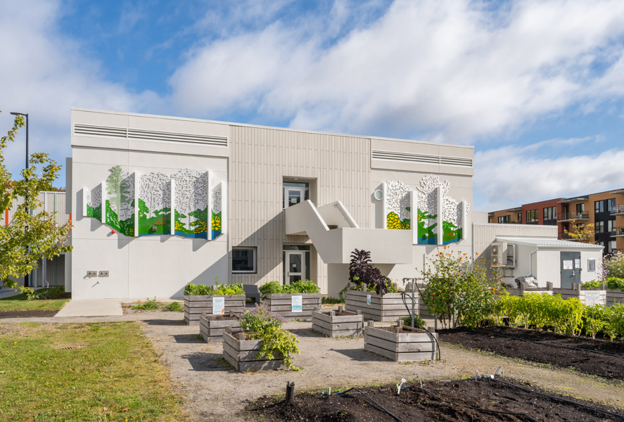 Les formes aux multiples trouées rappelant les arbres du boisé sont enchâssées de saillies verticales en continuation des caractéristiques architecturales de cette construction moderne de 1972. Vue de près, l’œuvre peut sembler abstraite, alors qu’on distingue nettement le paysage de loin. Elle invite à repenser notre rapport au temps, à nous harmoniser à la lente évolution de la nature.