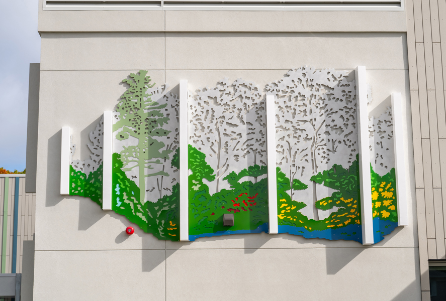 Ce paysage forestier célèbre la préservation de la nature et du patrimoine bâti. Par un chevauchement de plans d’aluminium colorés, le bas-relief offre au regard une version schématisée du boisé Neilson situé à proximité.