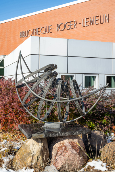 Cette sculpture qui allie le laiton et le granite orne l’entrée de la bibliothèque. Elle emprunte la forme des membrures d’un navire, rappelant que l’anse du Cap Rouge a abrité au 19e siècle un chantier de construction navale.