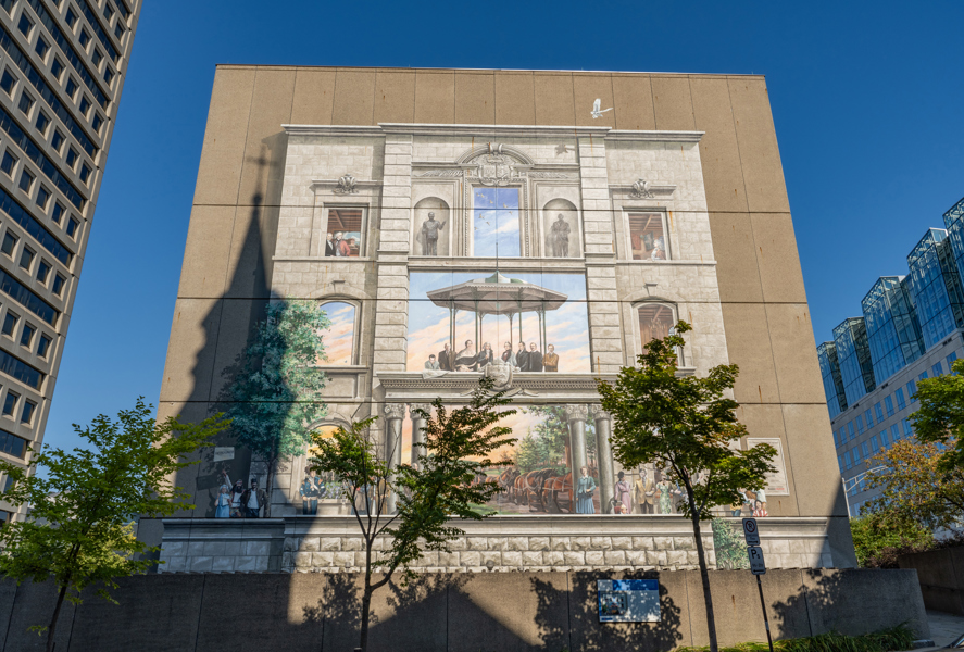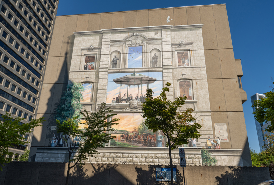 Consacrée aux 400 ans de la vie politique à Québec, cette murale dépeint la façade de l'hôtel du Parlement où figurent divers personnages qui ont marqué le paysage politique du Québec.