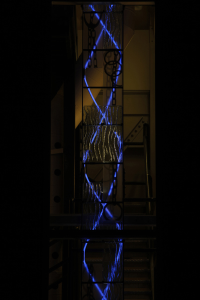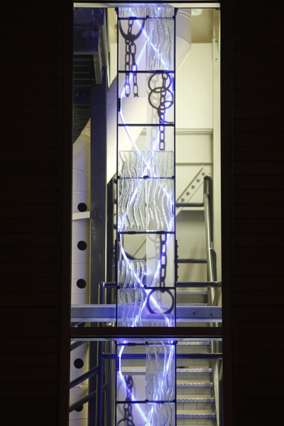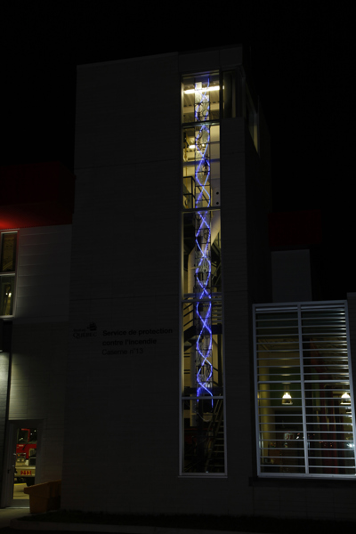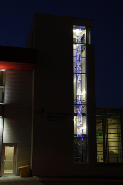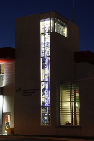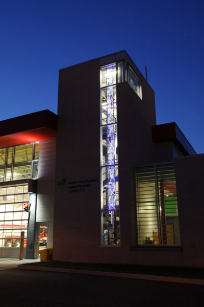 La caserne de pompiers est mise en valeur par une œuvre d’art qui emprunte la forme d’une grande échelle. La structure, faite d’acier, intègre des plaques de verre thermoformé pour donner l’aspect d’une surface vitrée éclaboussée par l’eau. Sur des carreaux de plexiglas givré, des images ont été imprimées; on y devine, en silhouette, le système de chaînes et d’anneaux servant à hisser et suspendre les tuyaux d’incendie pour les faire sécher. Le soir venu, un éclairage intégré au néon bleu fait ressortir toutes les caractéristiques de l’œuvre.