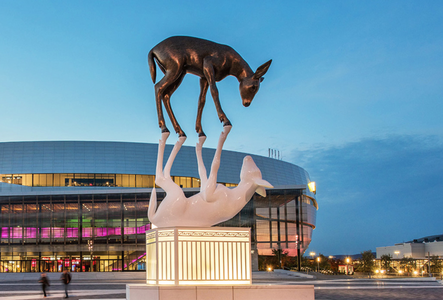 Monumentale, cette rencontre improbable fait tourner les têtes sur la place Jean-Béliveau. La sculpture de bronze de plus de 11 mètres de haut met-elle en scène un cerf penché sur son reflet? Ou un face-à-face avec autre cerf? Sa présence rappelle que la forêt n’est pas si loin de la ville de Québec. Le socle comporte un motif en lame de patin inspiré des rambardes d’escalier traditionnelles du quartier.