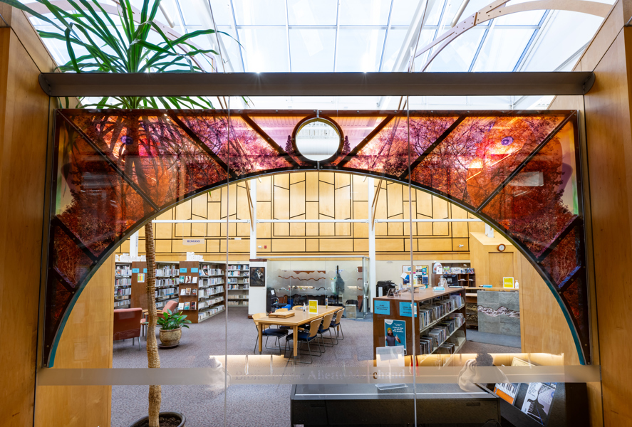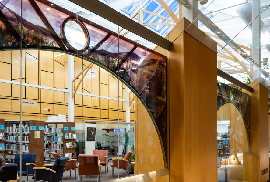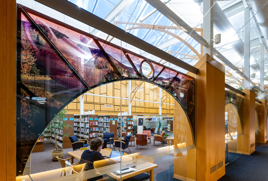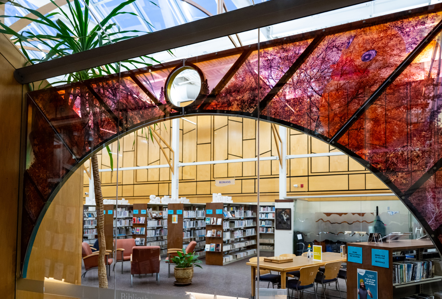 L’œuvre est composée de quatre arches qui servent de support à des photographies tout en transparence évoquant la nature.