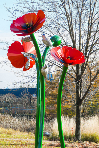 Comme surgi d’un conte fantastique, un bouquet de coquelicots géants invite à découvrir la nature. Sous les flamboyantes corolles, des animaux miniaturisés ont pris d’assaut les hautes tiges. Ils scintillent au soleil, évoquant l’esprit ludique d’enfants curieux.