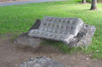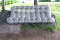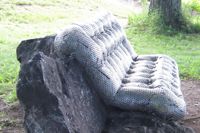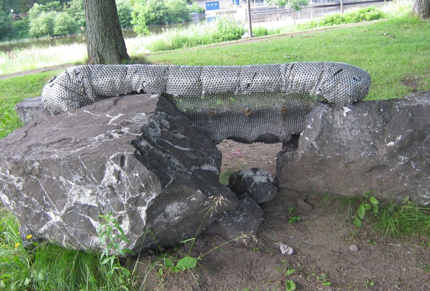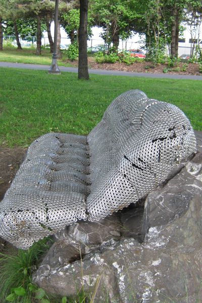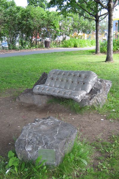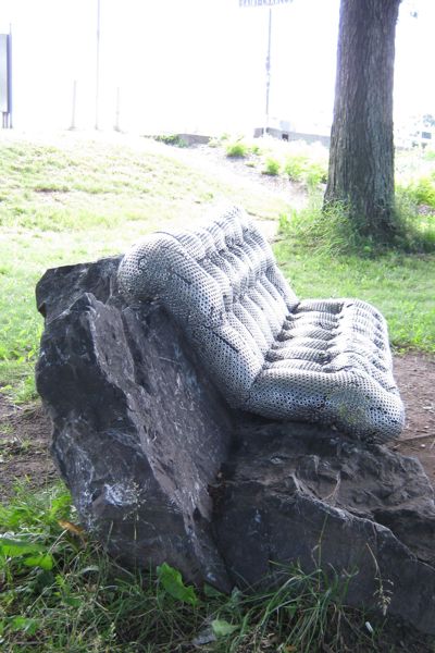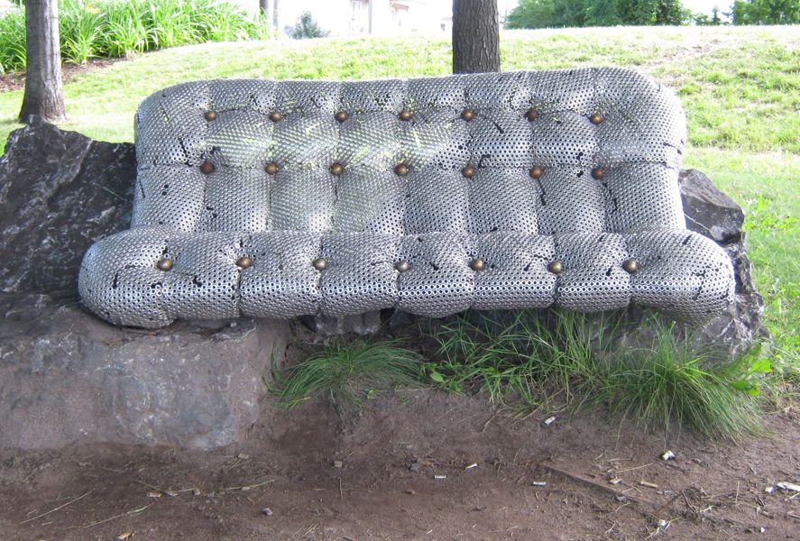 Ce canapé bien coussiné invite le passant à prendre un moment de repos. Attention, il est moins moelleux qu'il le semble de loin! Son revêtement se compose de milliers d'écrous de métal – un rappel des industries qui bordaient jadis ce cours d'eau. L'œuvre explore le jeu des apparences. Avec humour, elle rend aussi hommage à l'anatomie humaine, son titre signifiant « qui a de belles fesses ».