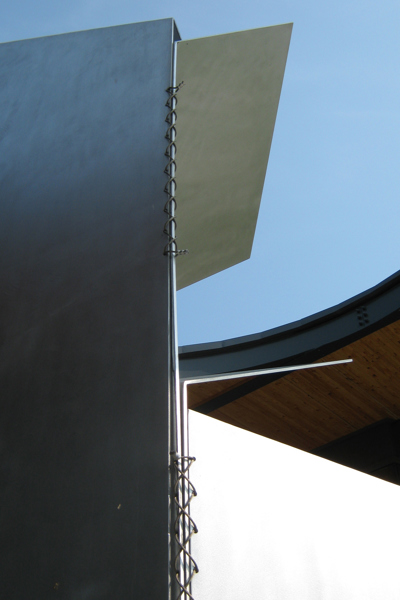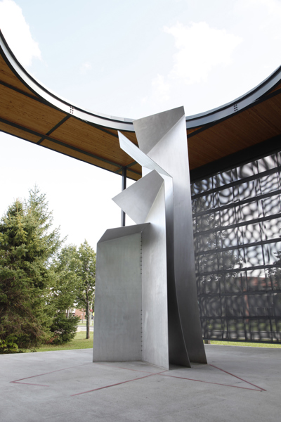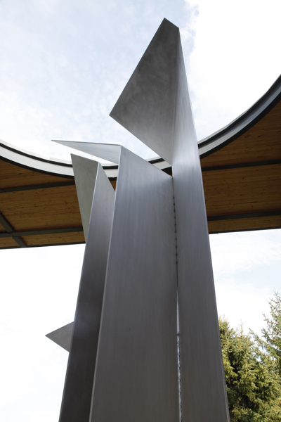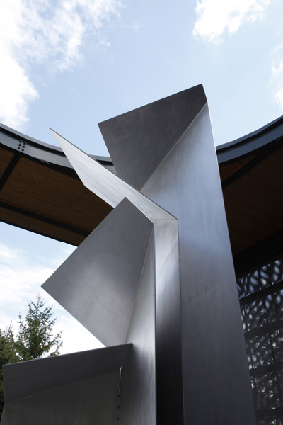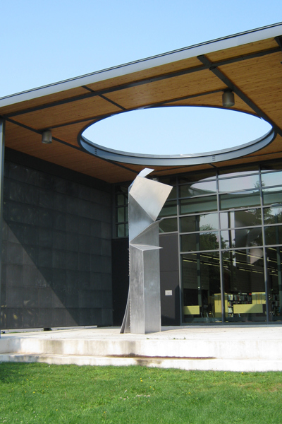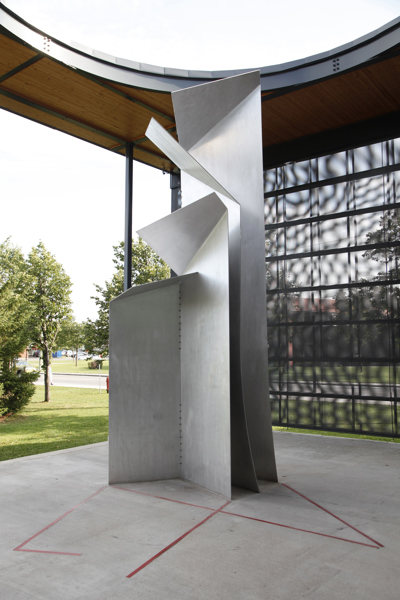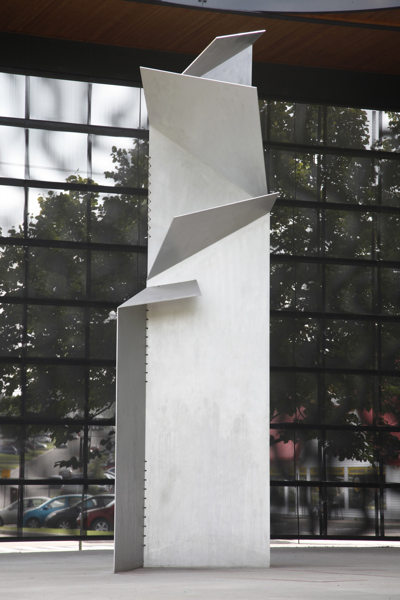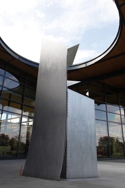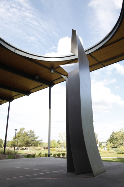 Postée du côté du parc qui jouxte la bibliothèque Félix-Leclerc, la sculpture est mise en évidence par un éclairage zénithal provenant d’une ouverture circulaire pratiquée dans la structure qui l’encadre. La lumière joue sur les feuilles d’aluminium finement texturé, reliées entre elles par des câbles tressés en acier inoxydable. Les coins repliés telles les pages d’un livre donnent à la sculpture l’aspect d’un origami tantôt ouvert, tantôt fermé, selon l’angle où on l’observe.