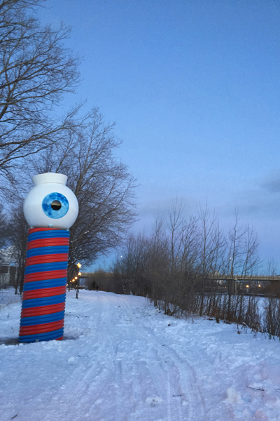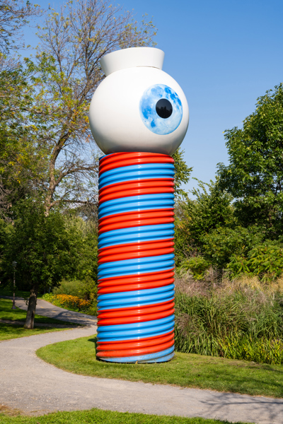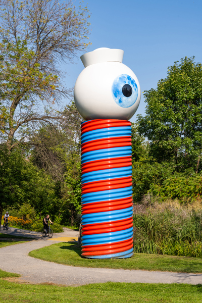L’œuvre en deux parties est implantée de part et d’autre de la rivière Saint-Charles. Sur la rive sud, l’œuvre est installée au cœur de la Marina Saint-Roch tandis que sur la rive nord, elle est sise sur le site de la Maison Dorion-Coulombe, en bordure du parc linéaire de la Rivière-Saint-Charles, dans le quartier Limoilou. L’œil humain est intimement lié au phare dans l’imagerie populaire puisque, réunis, ces deux symboles suggèrent l’idée paradoxale de voir et d’être vu.