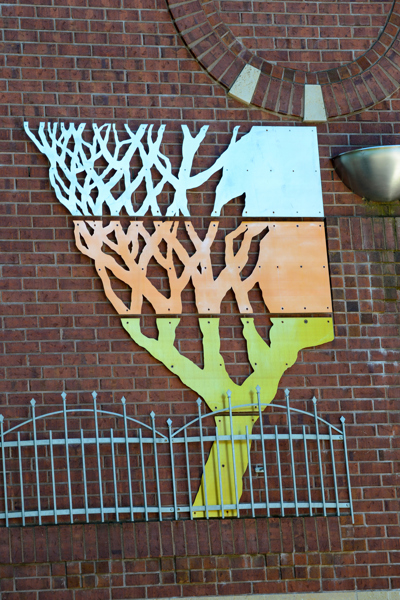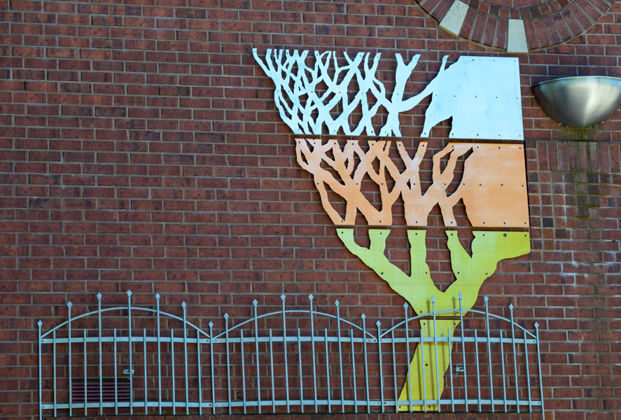 Cette murale emprunte la forme d’un tilleul où trois saisons sont représentées, la quatrième étant l’imaginaire, tandis qu’au-dessus, l’horloge rythme le passage du temps. Un vase de métal contient la mémoire en éveil.