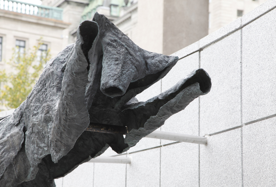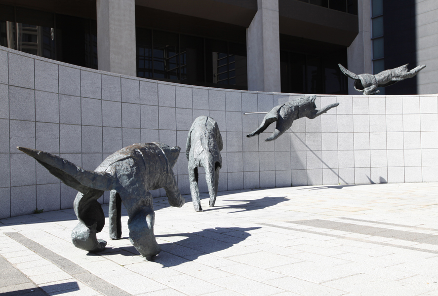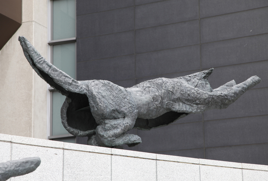 Bien intégré à l’architecture et à l’environnement urbain, ce groupe de bronzes reconstitue le mouvement d’un animal en plein élan.
