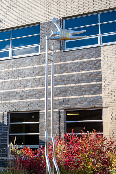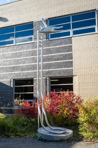 Cette œuvre, située sur le terrain avant de l'école des Prés-Verts, a été réalisée dans le cadre de la Politique d'intégration des arts à l'architecture et à l'environnement.