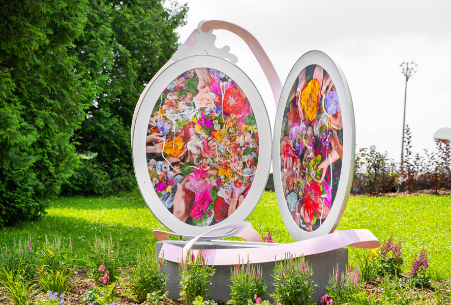 Cette œuvre rappelle l'importance du legs féminin intergénérationnel qui jette des ponts entre le passé et l'avenir. Fruit d'une collaboration avec un groupe communautaire de femmes, elle célèbre la solidarité féminine. Les fleurs symbolisent l'affection mutuelle des femmes, alors que leurs mains évoquent leur tradition artisanale. Sise à l'ancien emplacement de l'église Bon-Pasteur, témoin de la fondation et des activités du groupe, cette création met en lumière le potentiel de ce lieu de partage d'expériences et de savoir-faire.