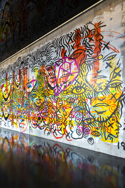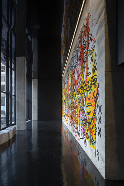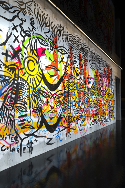 Cette murale située dans le hall du Diamant est visible par la grande baie vitrée qui donne sur la rue des Glacis. Elle constitue un hommage au bar Le Shoeclack déchaîné, repère de la culture underground du début des années 1980. Le balado du Diamant, à écouter en regardant l’œuvre, permet de déchiffrer les références historiques de l’époque et d’entendre l’artiste Zïlon (1956-2003), une figure importante de l’art urbain.