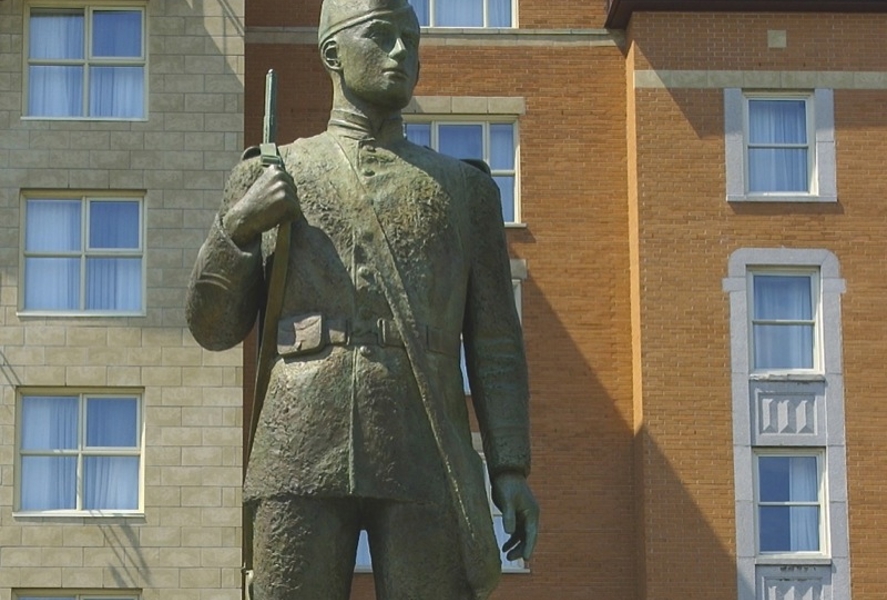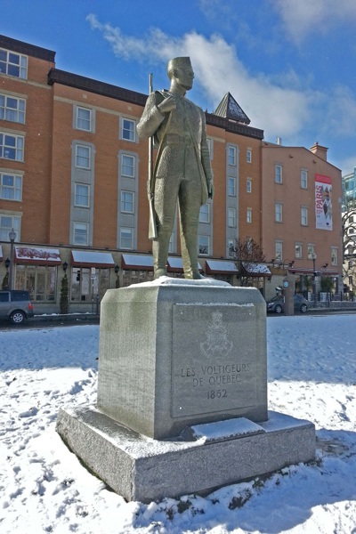 Constitué en 1862, le régiment des Voltigeurs appartient au patrimoine de la ville de Québec à titre de plus ancien corps de troupe canadien-français. Le monument immortalise un carabinier, arme en bandoulière et coiffé du calot que portaient les soldats chargés de rétablir la paix lors de la rébellion des Métis du Nord-Ouest en 1885.